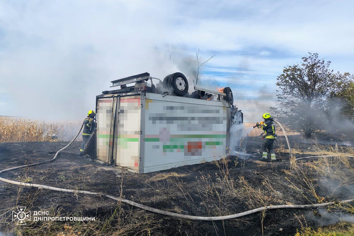 Внаслідок ДТП загорілися вантажний автомобіль «Iveco 75E13» та легковий автомобіль «ВАЗ 21063». Також горіла суха трава на узбіччі дороги.