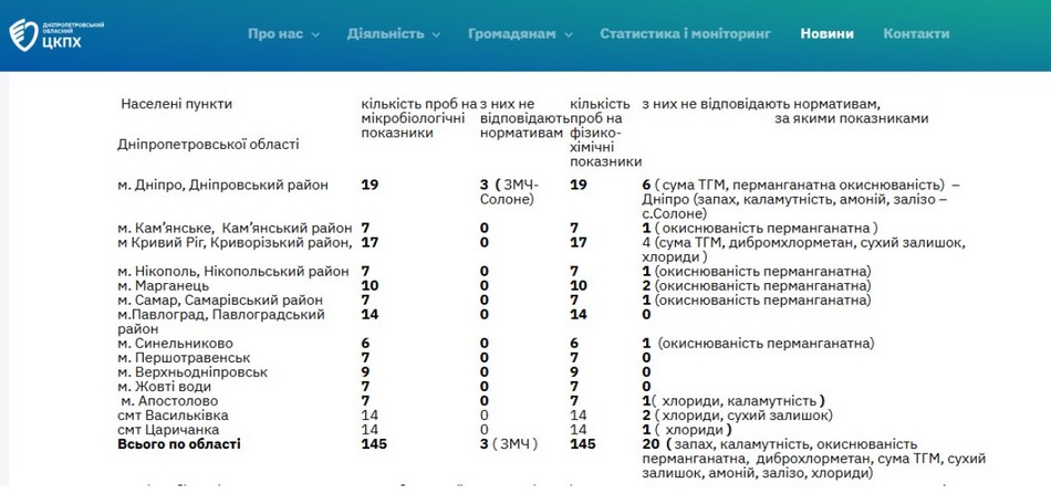 Згідно з офіційними даними, три проби води не відповідали встановленим вимогам за показником ЗМЧ (загальне мікробне число). Порушення було зафіксовано у селі Солоне Дніпровського району. При цьому збудників інфекційних захворювань, які загрожують здоров’ю населення, у досліджених зразках виявлено не було.