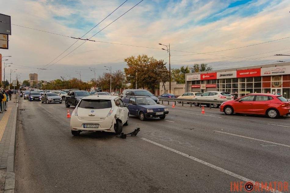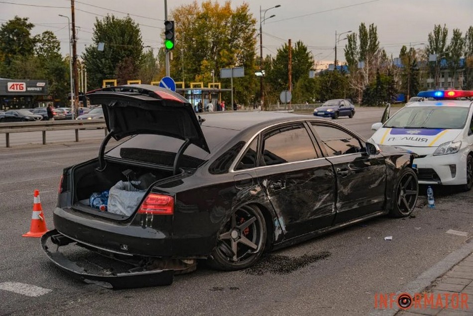 У понеділок, 6 жовтня, на Слобожанському проспекті у Дніпрі сталося декілька ДТП. Спочатку в районі зупинки “Донецька” Audi зіштовхнувся з BMW. Після цього водій першої автівки, тікаючи з місця аварії, на великій швидкості протаранив автомобілі Nissan та Honda навпроти ТЦ «Наша правда». Від удару Nissan відлетів у Seat, який їхав поруч.