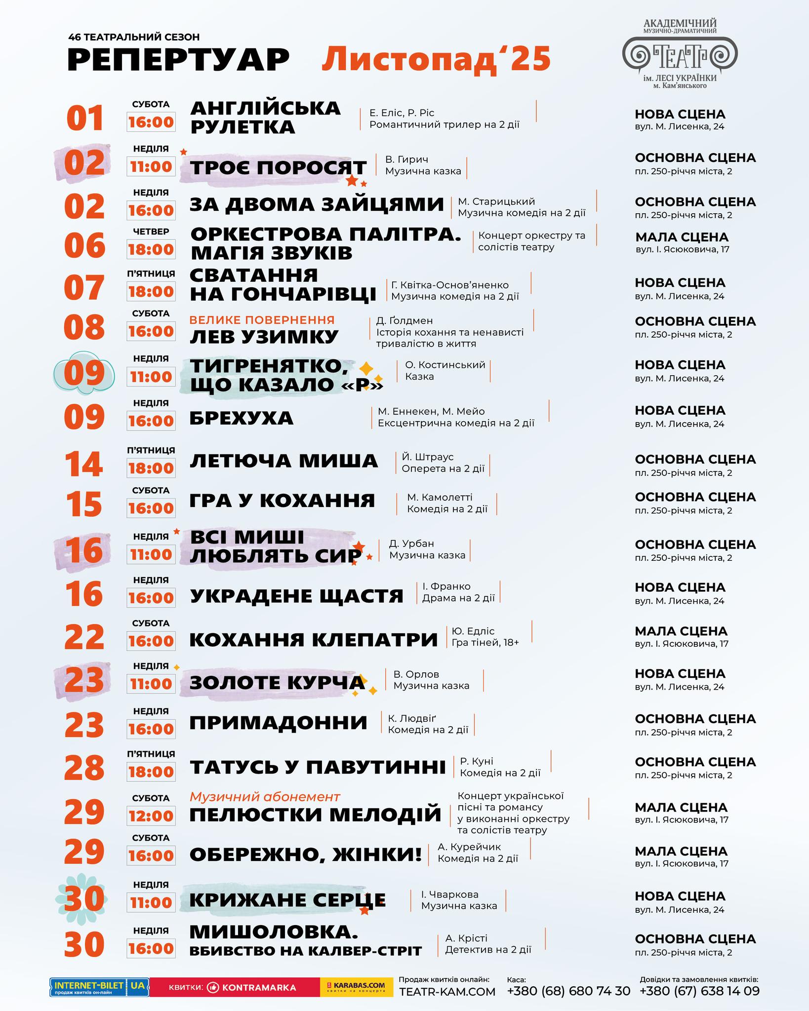 У листопаді в кам’янському Театрі ім. Лесі Українки на глядачів чекають: