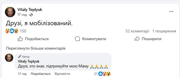 Про це артист розповів у своєму Facebook. Віталій Теплюк 26 жовтня опублікував допис, де коротко зазначив, що його мобілізували. Також він звернувся до підписників з особистим проханням. Актор попросив підтримати його маму.
