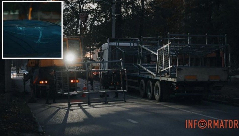 Станом на 16:39, легковик прибрали з дороги. На місці працював автокран, який піднімав металеві конструкції на вантажівку.