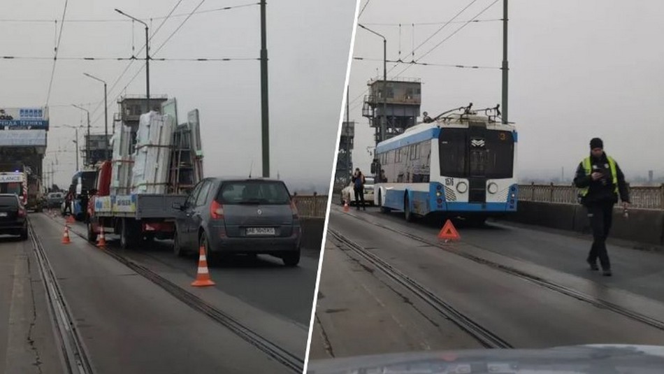Усі подробиці аварії уточнюються. Рух тролейбусів Старим мостом фактично зупинився. Місце зіткнення відгородили.