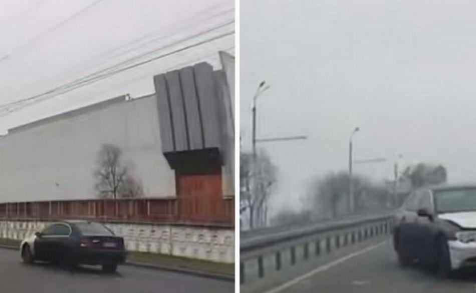 На кадрах видно, що машину занесло вліво і вона в’їхала у відбійник. Попередньо, ніхто не постраждав.