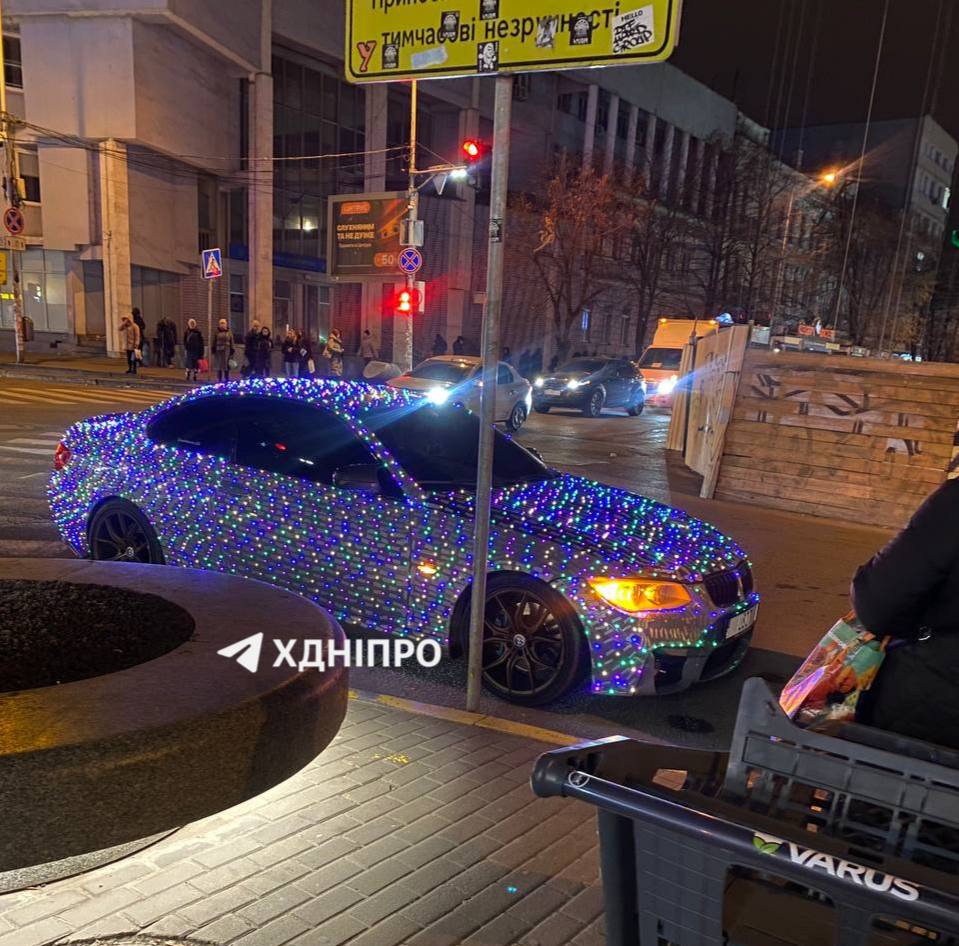 У Дніпрі біля ТРК помітили автомобіль BMW, прикрашений гірляндами. Фотографію “святкової” машини поширили міські Telegram-канали, передає “Відомо”.