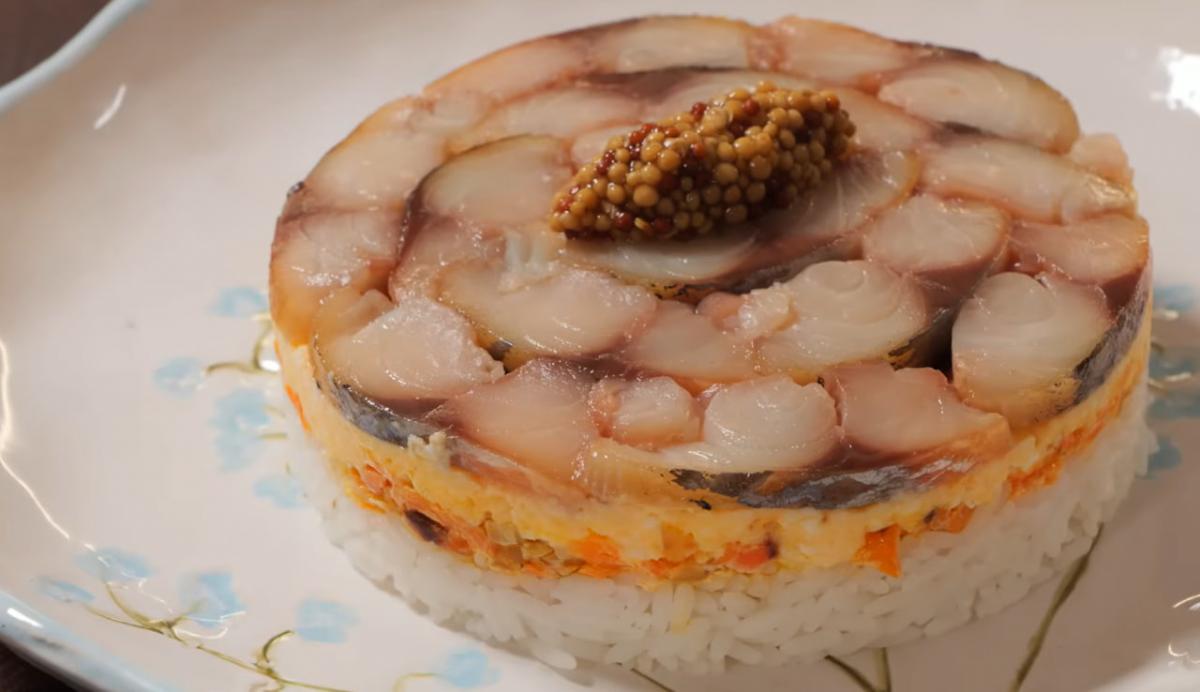 4. На велику пласку тарілку поставити кондитерське кільце або роз’ємну форму для запікання, викласти першим шаром рис, потім овочеву масу, потім яйця. Зверху розмістити в’ялені томати, злегка утрамбувати. Наприкінці викласти шматочки скумбрії, прикрасити гірчицею в зернах або ікрою.