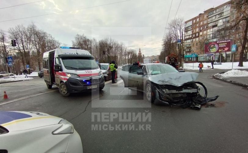 В результаті зіткнення у обох автівок сильно розбиті передні частини. На місці аварії працюють поліцейські та бригада “швидкої”. Медики оглядають водійку Kia.