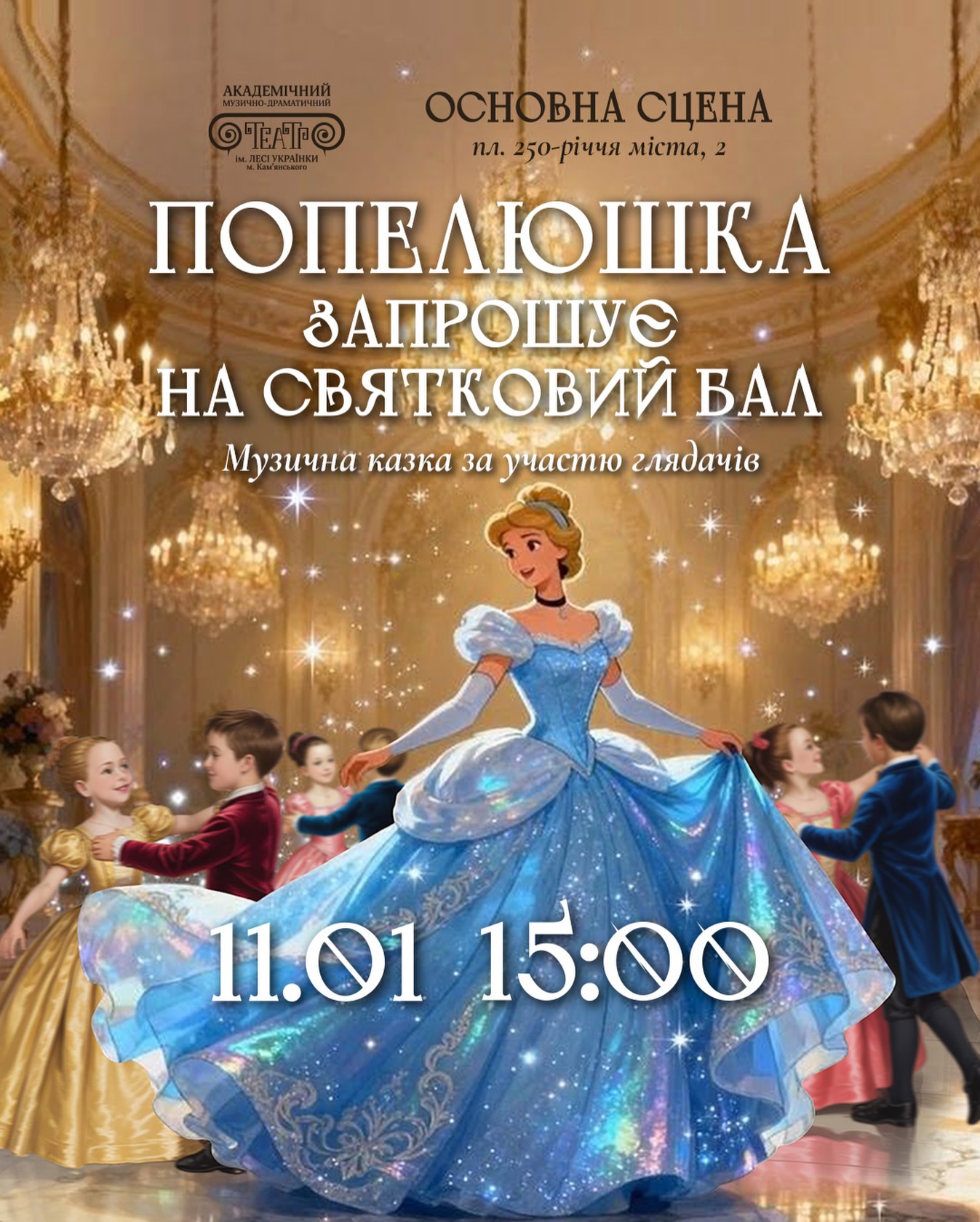 Чарівна музична казка за участю глядачів, де диво стає реальністю. Приєднуйтеся до чарівного балу у Театрі ім. Лесі Українки разом із героями казки.