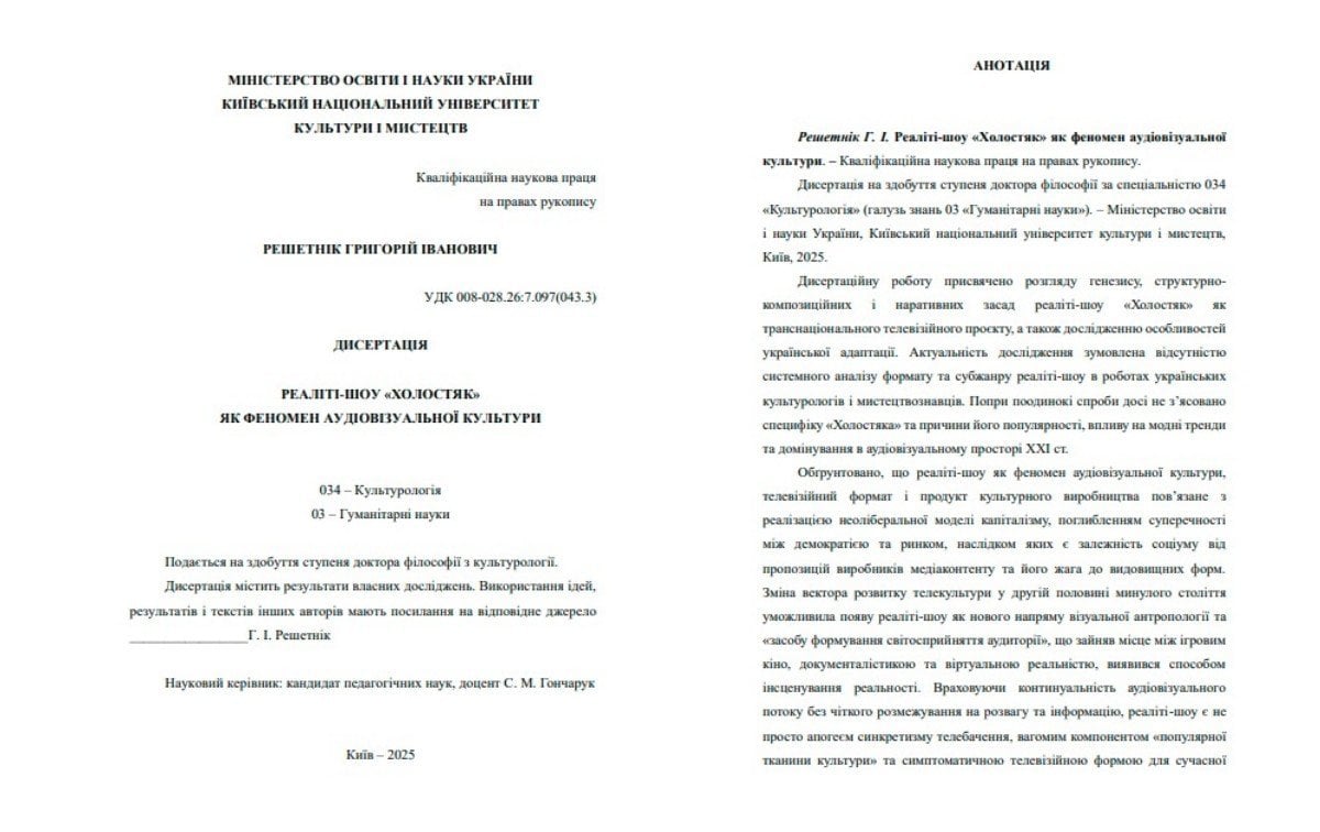 Зірка підтвердив, що офіційно здобув науковий ступінь доктора філософії. Так, останніми днями в Мережі активно обговорювали інформацію про захист дисертації Решетніка. Ведучий не став мовчати й заявив, що він дійсно захистив наукову роботу ще у вересні минулого року в Київському національному університеті культури і мистецтв, де нині викладає. Щоправда, найбільше дискусій викликала тема дослідження — вона була присвячена реаліті-шоу «Холостяк», ведучим якого Григорій є вже багато років. На хвилю критики шоумен відповів публічно — у Threads він пояснив свою позицію та наголосив, що тема його дисертації є цілком логічною та фаховою.