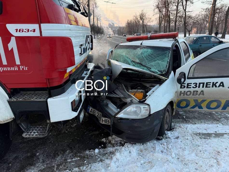 На вулиці Вадима Гурова (колишня Постишева) у Кривому Розі вранці 13 січня легковий автомобіль Dacia Logan охорони влетів у пожежну автівку, передає “Відомо” з посиланням на Телеграм-канал “Свої — Кривий Ріг”.