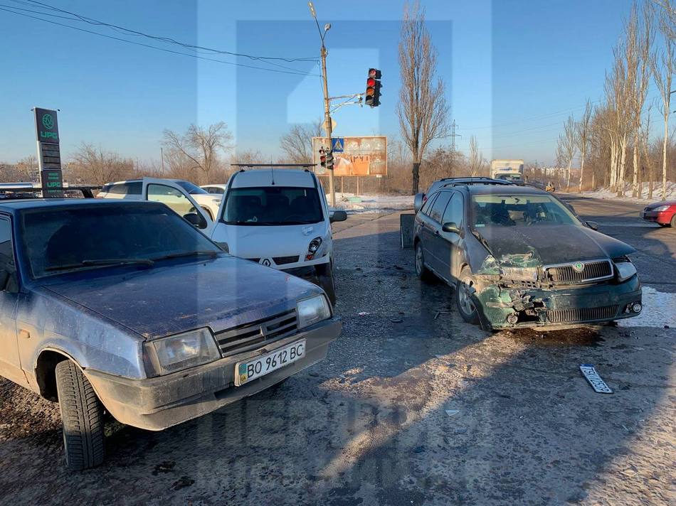 Аварія сталася біля Fozzy на Вечірньому. За словами кермувальника Lada, його автівка та Renault стояли на світлофорі й почали рух у бік Східного на зелене світло. Раптом вони відчули удар. Ймовірно, через те, що водія Skoda, який рухався з іншого боку перехрестя, засліпило сонце, він не помітив червоний сигнал і врізався у Renault. Від удару Renault відкинуло на Lada, що повертали у бік супермаркету.