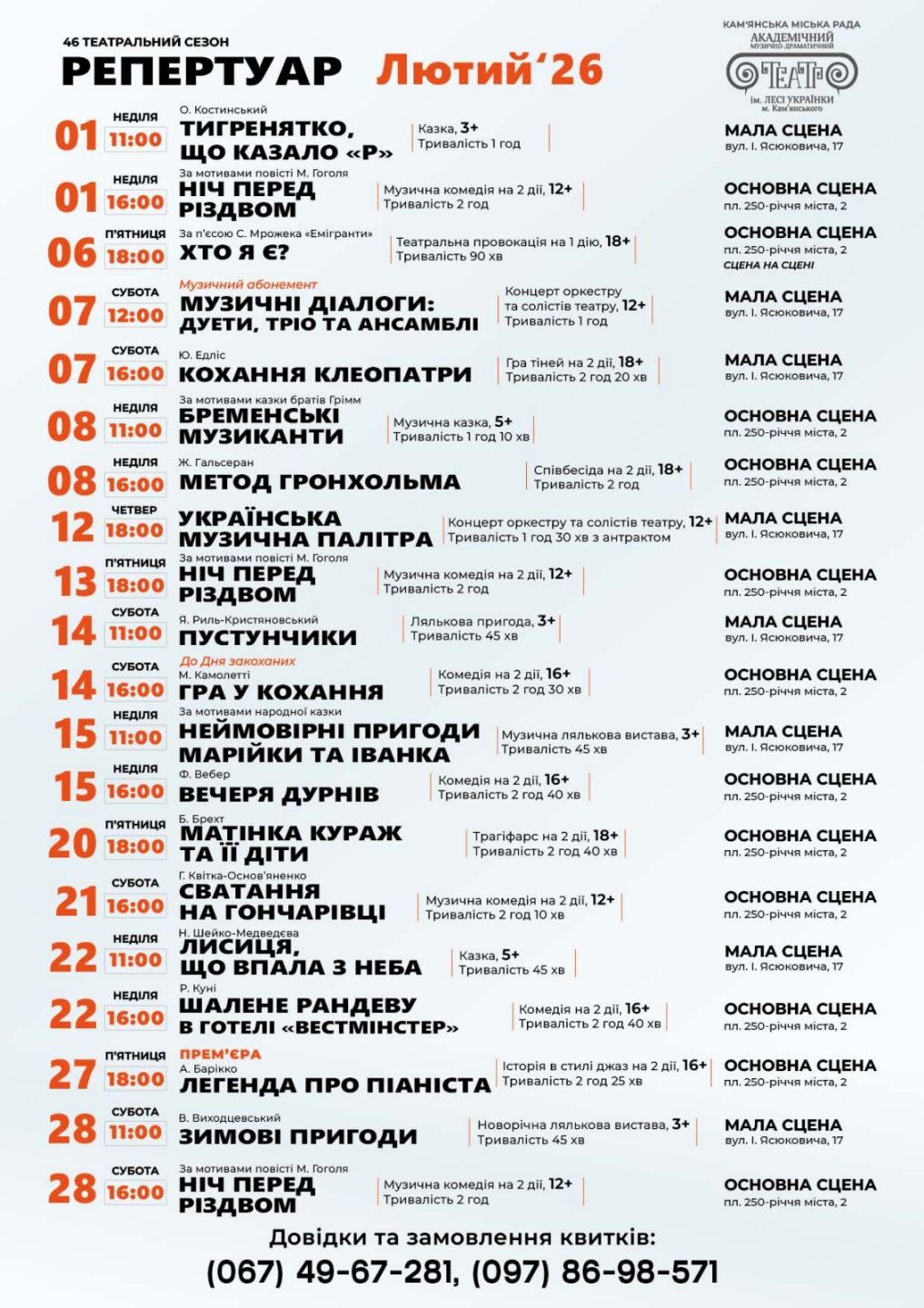 Культура Що подивитися у театрі Кам’янського в лютому 26.01.2026 коментувати Театр ім. Лесі Українки презентував репертуар на лютий. Шикарні вистави, неймовірна гра акторів та незабутні враження. Кількість переглядів: 4 Кам'янське театр