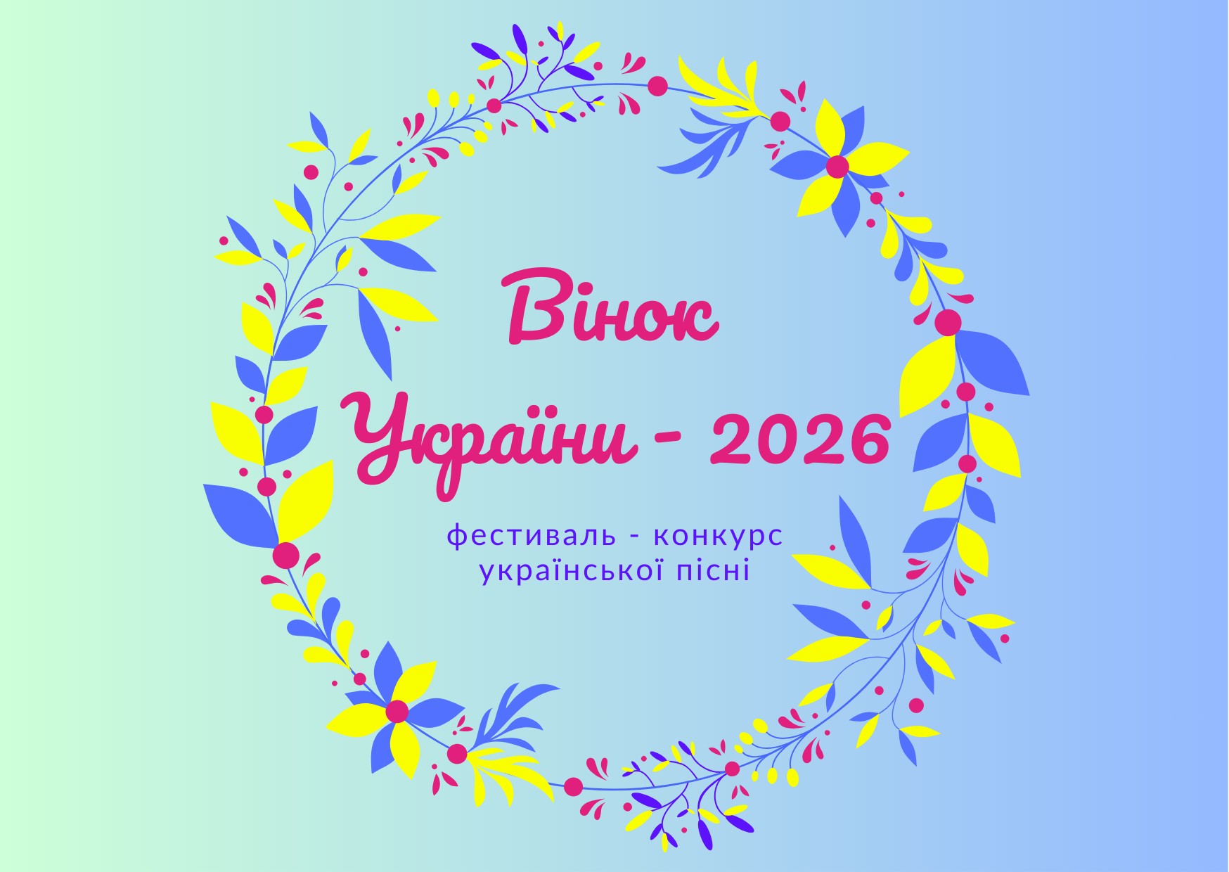 Управління молоді та спорту запрошує молодь Кам’янської міської територіальної громади взяти участь у молодіжному фестиваль-конкурсі української пісні «Вінок України – 2026».Молодіжний фестиваль-конкурс української пісні «Вінок України – 2026» (далі – фестиваль-конкурс) проводиться серед молоді Кам’янської міської територіальної громади з метою виявлення та розкриття талановитих виконавців у жанрі вокального музичного мистецтва, збагачення духовного світу, естетичного розвитку та виховання творчої молоді, стимулювання творчого росту митців у системі формування сучасної української музичної культури, популяризації та підтримки української пісні.