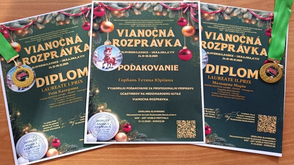 Участь вихованців Кам’янської школи мистецтв №4 у Міжнародному онлайн-конкурсі талантів “Vianočná rozprávka” перетворилася на справжню різдвяну історію успіху. Творчі змагання проходили з 24 по 30 грудня 2025 року в межах культурного співробітництва між Словаччиною та Україною за сприяння WAF – Art World Festivals (м. Кошице).