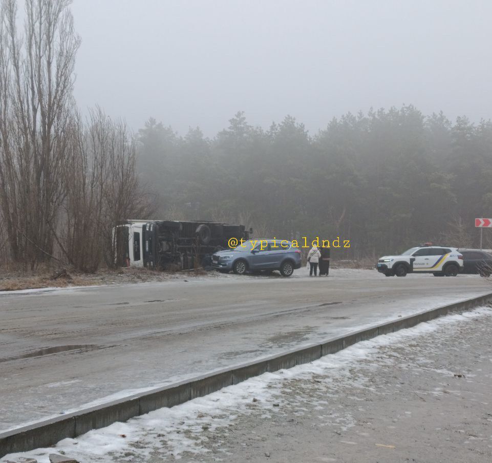 В результаті аварії перевернувся вантажний автомобіль. Попередньо, водій не впорався із керуванням на слизькій дорозі.