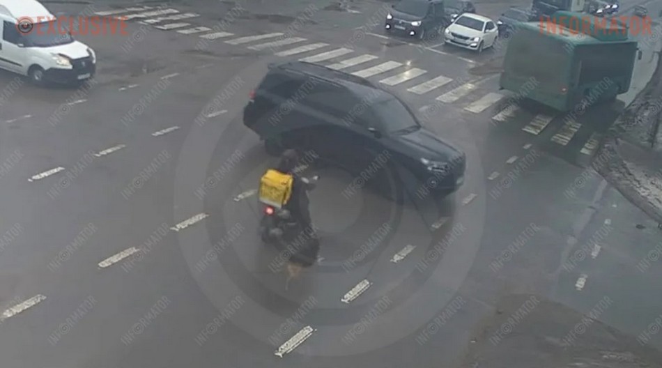 Кур’єр врізався у Toyota, проте не впав, а одразу після зіткнення став на ноги. Песик же злякався і побіг геть. Усі обставини ДТП з’ясовують правоохоронці.