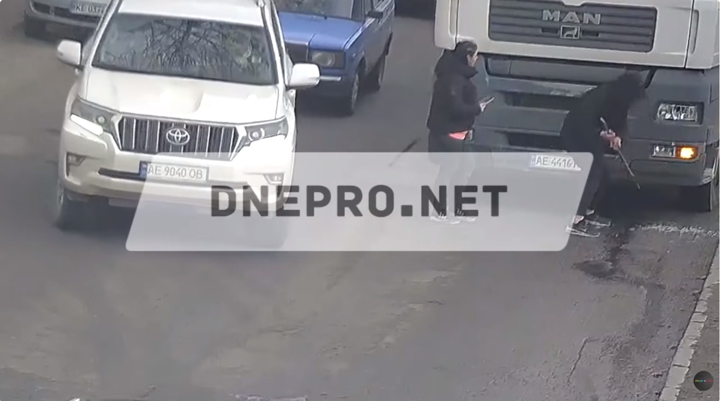 Вочевидь, фура зачепила автомобіль, з якого вискочила компанія молодиків та побігла на “розбірки” з водієм фури. Сварка супроводжувалася гучною лайкою, а потім один з чоловіків озброївся металевою трубою та розтрощив фари у вантажівки.