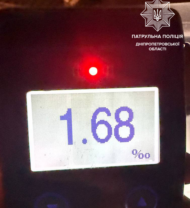 Водія автомобіля Opel помітили під час комендантської години у Новокодацькому районі. Кермувальник проігнорував вимогу про зупинку і намагався зникнути з поля зору поліцейських, втім, його зупинили. Чоловік мав ознаки алкогольного сп’яніння і пройшов освідування. Результат — 1,68 проміле алкоголю в його крові. На нього склали відповідний протокол, а також постанови за невиконання вимоги про зупинку та за те, що водій керував авто, хоча позбавлений такого права судом.