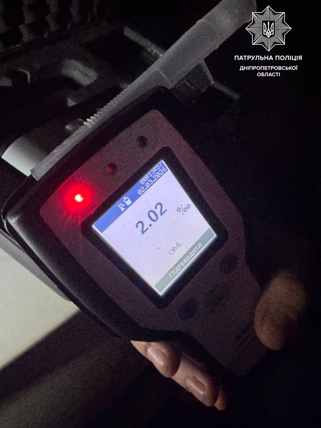У Самарському районі патрульні зупинили водія автомобіля ЗАЗ. Він мав ознаки алкогольного сп’яніння та погодився пройти освідування. Результат — 2,02 проміле алкоголю. На нього склали протокол за ч.1 ст.130 (Керування у стані сп’яніння) КУпАП.