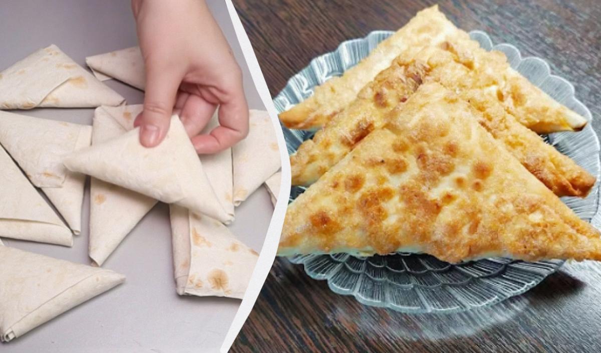 2. Приблизно подивіться, скільки у вас фаршу і смужок вийшло – важливо розділити порівну, щоб інгредієнтів вистачило на все. Далі потрібно викласти фарш на смужку лаваша так, щоб вийшов рівнобедрений трикутник, а потім кілька разів обернути вільним краєм лаваша фарш, формуючи конверт. Залишився край загорнути всередину, щоб закрити всі отвори. Таким чином зробити напівфабрикати з усього фаршу і смужок лаваша.