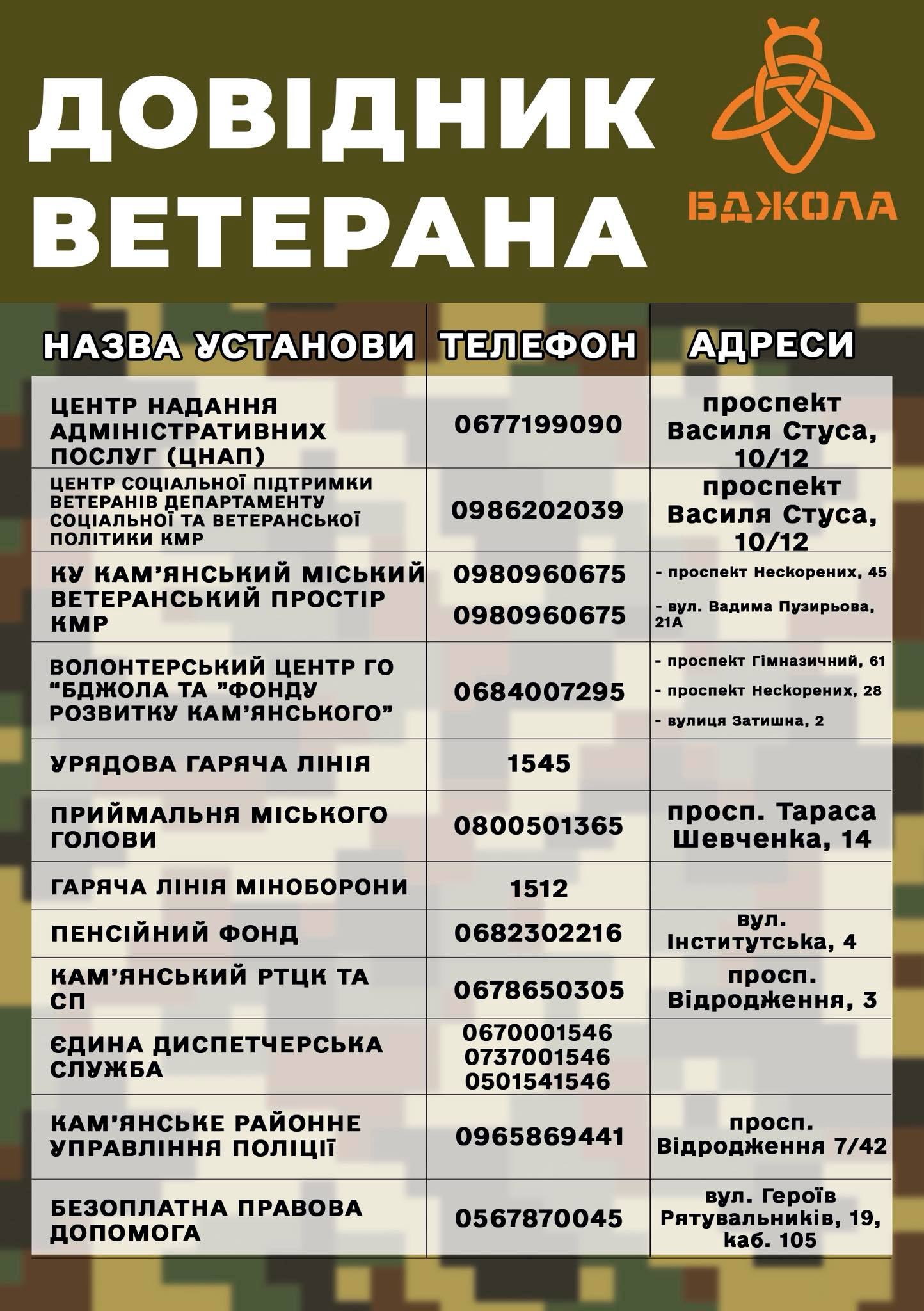 Саме тому публікуємо «Довідник ветерана» – зручний перелік установ, контактів, номерів телефонів та адрес служб, які можуть стати в нагоді ветеранам та їхнім родинам.