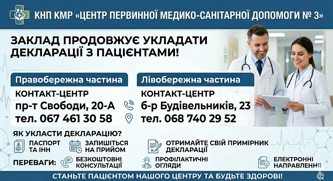 Укладання декларації з лікарем первинної медичної допомоги є необхідною умовою для отримання гарантованого пакета медичних послуг у межах Програми медичних гарантій, яку реалізує Національна служба здоров’я України. Станом на сьогодні в камянському КНП КМР “Ценр первинної медико-санітарної допомоги №3” (колишня “Поліклініка вогонників”) є лікарі, які ще мають можливість укладати декларації з пацієнтами: