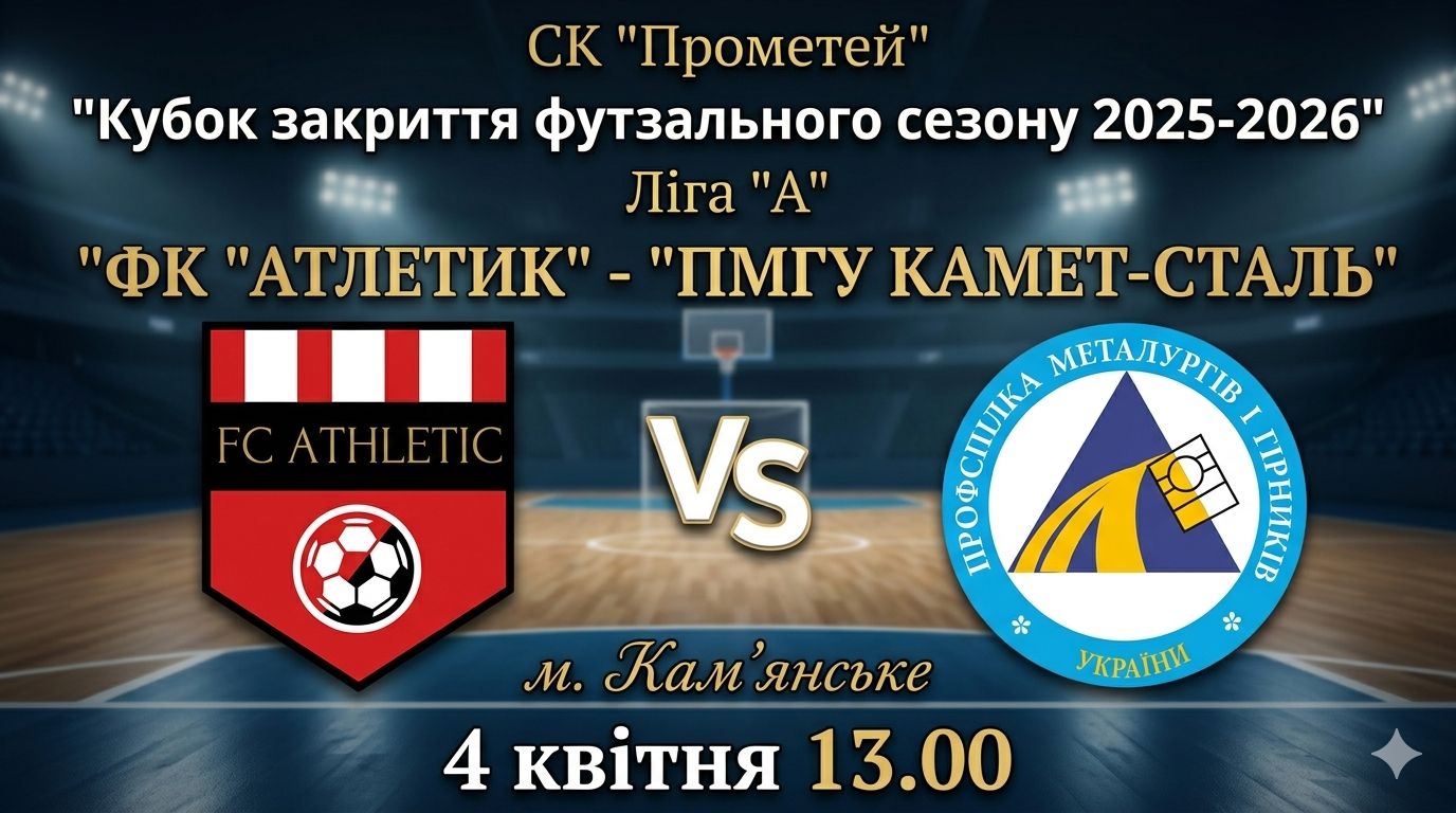 У Кам’янському 4 квітня, о 13:00, в СК “Прометей” відбудеться фінал Кубку міста Кам’янське “Кубок закриття футзального сезону” 2025-2026 Ліги “А” серед команд виробничих підприємств та аматорських колективів.