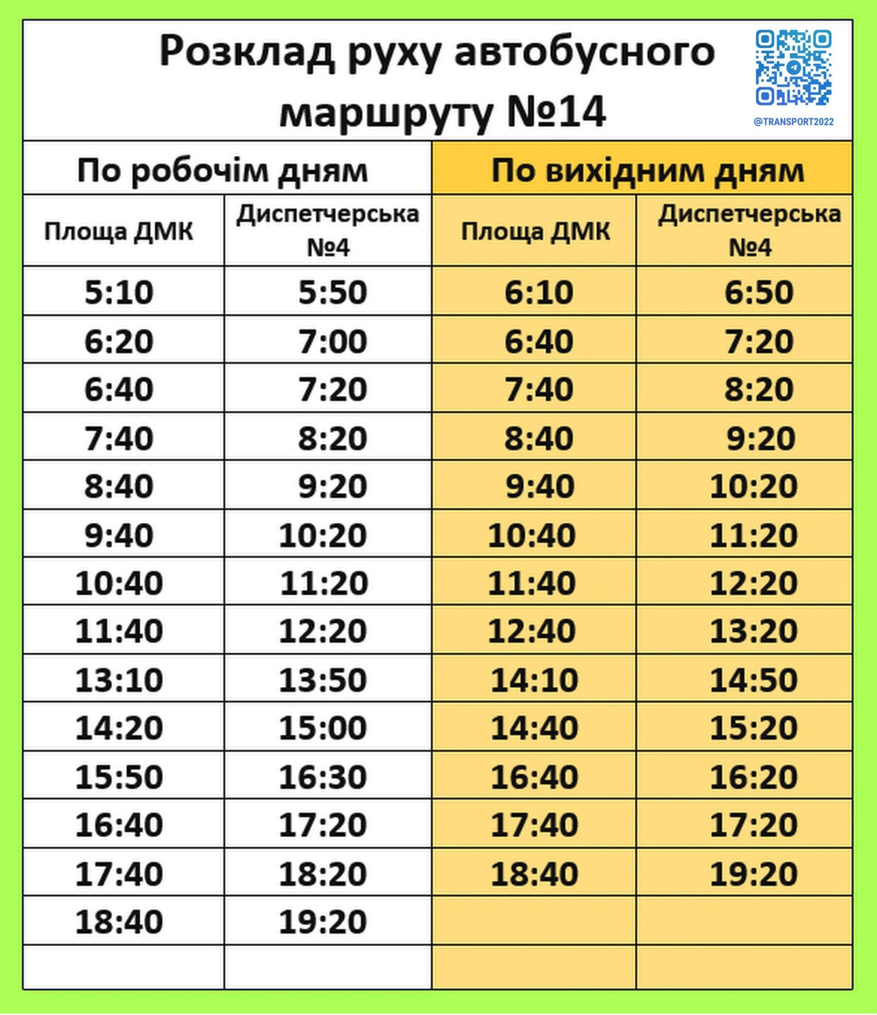 Суспільство Графік руху соціального маршруту №14 у Кам’янському 03.04.2026 коментувати На прохання пасажирів КП “Транспорт” надало актуальний розклад руху автобусного маршруту №14 по робочих та вихідних днях. Розклад діє на даний момент (квітень 2026р.). Кількість переглядів: 55 Кам'янське маршрутка