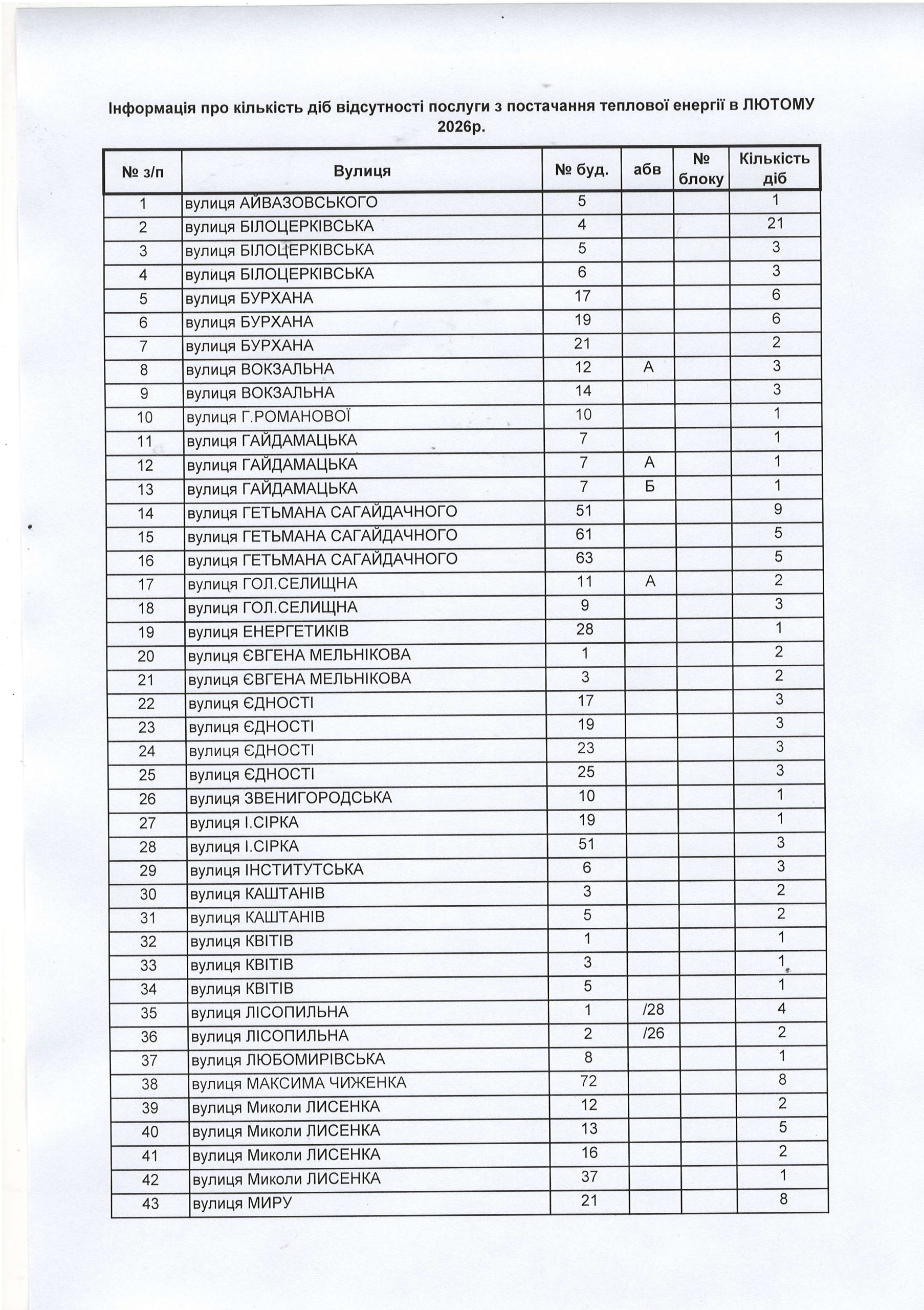 На виконання вимог Постанови Кабінету Міністрів України від 30.01.2026 №118 «Деякі питання здійснення перерахунку вартості комунальних послуг за період їх ненадання, надання не в повному обсязі або невідповідної якості у разі виникнення надзвичайної ситуації в період воєнного стану в Україні, АТ «Дніпровська теплоелектроцентраль» надає перелік будинків із кількістю діб відсутності послуги з постачання теплової енергії у лютому 2026 року.
