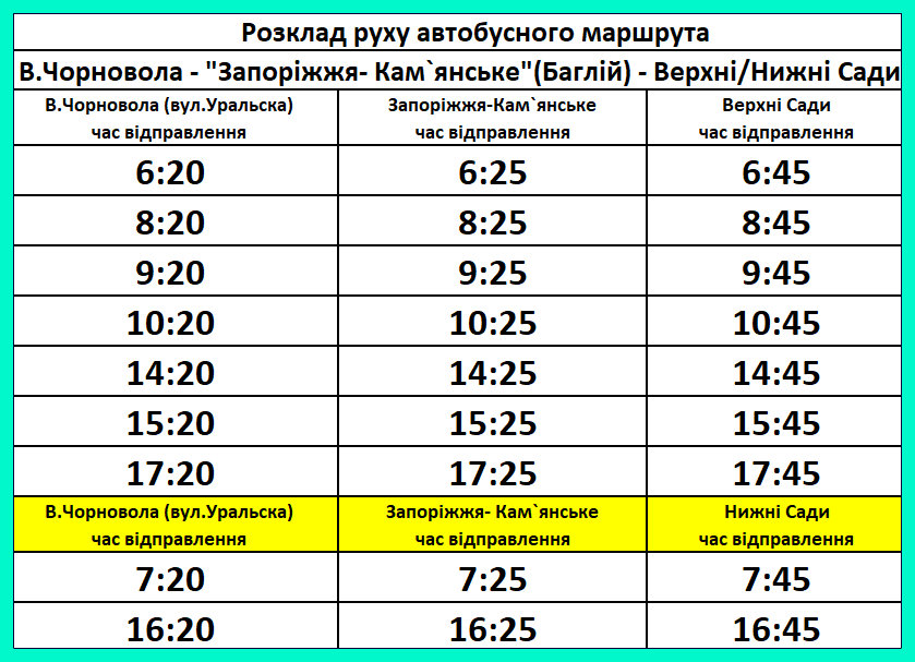 З 8 квітня 2026р. змінюється графік руху автобусного маршруту на “Баглійскі Сади” по маршруту: вул.Чорновола – станція “Запоріжжя – Кам’янське” (Баглій) – Верхні/Нижні Сади.