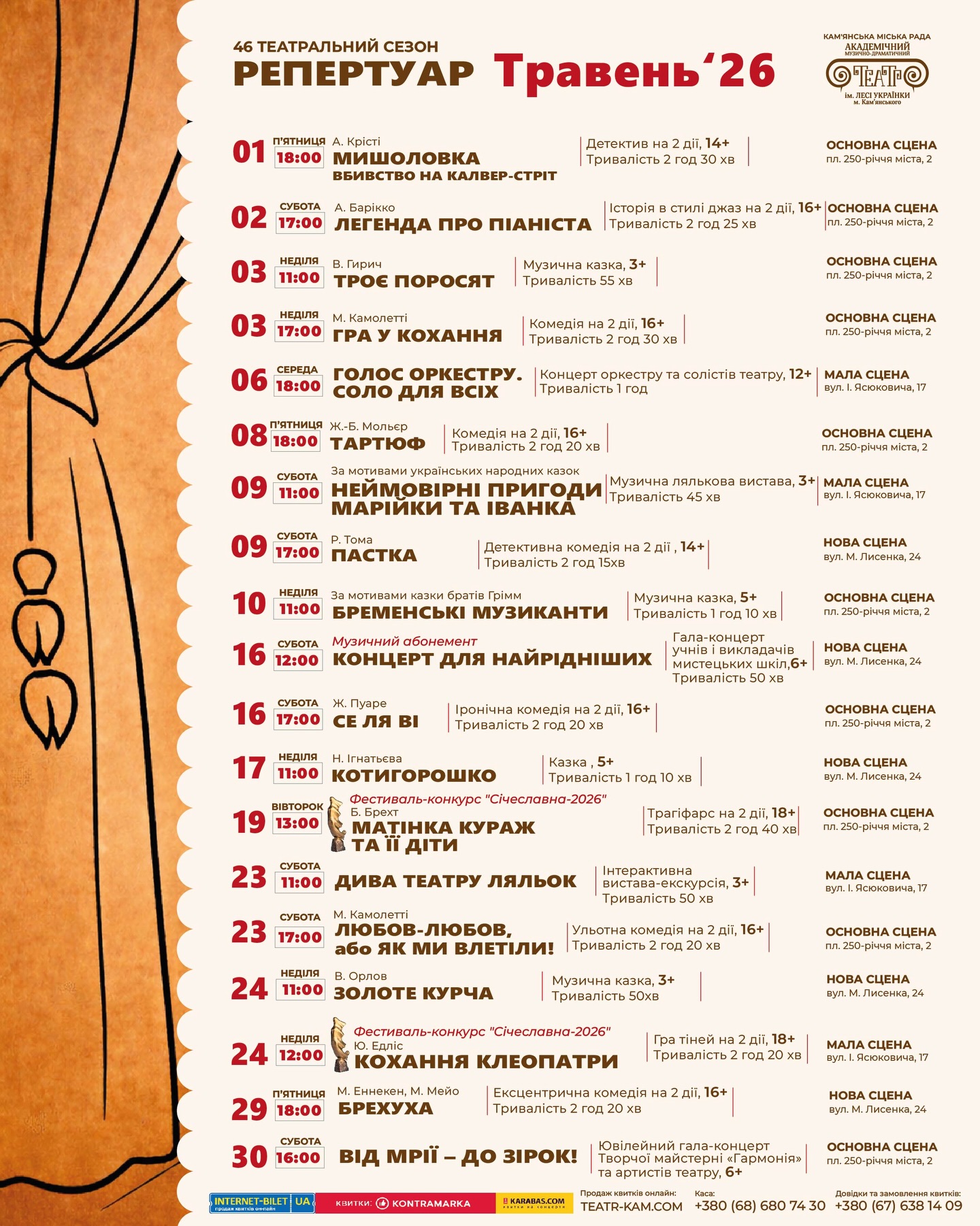 Культура Що покаже театр Кам’янського у травні 22.04.2026 коментувати Репертуар Театру ім. Лесі Українки на травень вже чекає. Тут — історії, що хвилюють, емоції, що залишаються, і вечори, які хочеться повторити. Обирайте свою виставу та приходьте розділити ці миті разом з акторами. Кількість переглядів: 32 вистава. театр Кам'янське