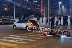 Volkswagen поворачивал на Слобожанский проспект. В это время в него на скорости влетел мотоцикл. В результате аварии водитель Honda получил ушибы.